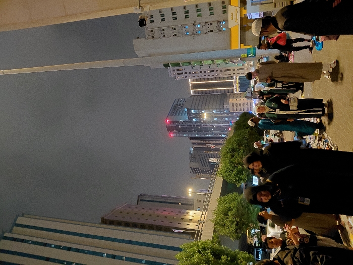 People in traditional garments stand in an urban setting near trees and buildings. Several individuals wear white caps and long robes, while others are in black attire. The scene takes place at night, illuminated by streetlights and lights from the tall buildings that form the backdrop of the cityscape.