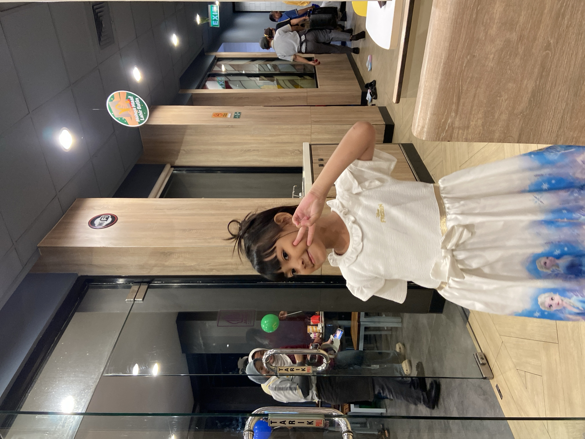 The image depicts the interior of a fast-food restaurant, likely a KFC or similar establishment, in Sidoarjo, Indonesia. In the foreground, a young girl, approximately 5-7 years old, is centered, looking towards the camera with a smile and making a peace sign with her left hand. She has dark hair tied in a partial bun and wears a white dress featuring a gold "FROZEN" inscription on the bodice and a white satin bow at the waist, with a blue "Frozen" themed print on the skirt depicting characters Elsa and Anna. Behind the girl, to the left, are glass double doors with vertical "TARIK PULL" (Indonesian and English for "PULL") stickers. Through these doors, two women are visible. One woman, presumably an employee, wears a light-colored headscarf, a striped shirt, and a dark apron, standing near the door handle. The second woman, wearing a darker headscarf, smiles and holds a green balloon. A blue balloon is also attached to the door handle. Inside the restaurant area beyond the doors, tables with cups and wrappers are visible. To the right of the girl, the interior features light wood-paneled walls and pillars, a dark dropped ceiling with square recessed lighting, and a visible "WiFi" circular sign on a pillar. A circular hanging sign with the text "Mohon Maaf Lahir Batin" (an Indonesian phrase for expressing apologies, commonly used during Eid al-Fitr) and an illustration of hands is suspended from the ceiling. Further into the background on the right, a hallway-like section is visible, with an "EXIT" sign prominently displayed above a doorway. An employee in a grey uniform with an apron is walking away from the camera in this hallway. Several pairs of slippers/sandals are on the floor in the hallway. The flooring varies between wood-patterned tiles near the girl and grey tiles beyond the glass doors.