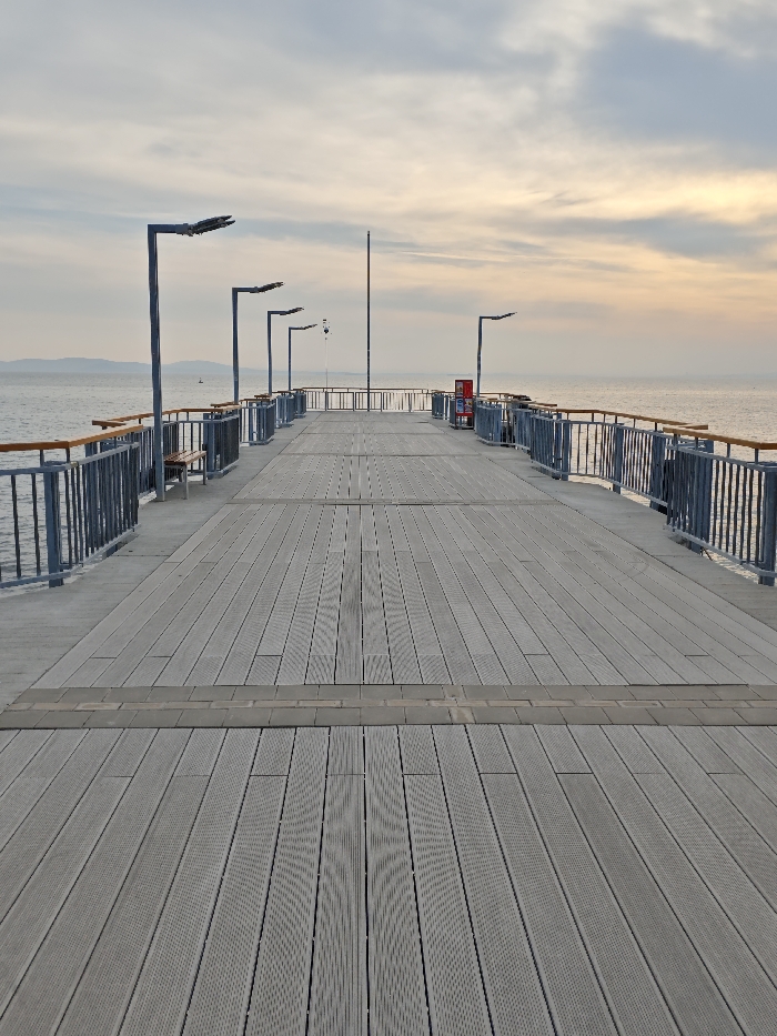 This image depicts a long, modern pier extending into the sea in Pomorie, Bulgaria