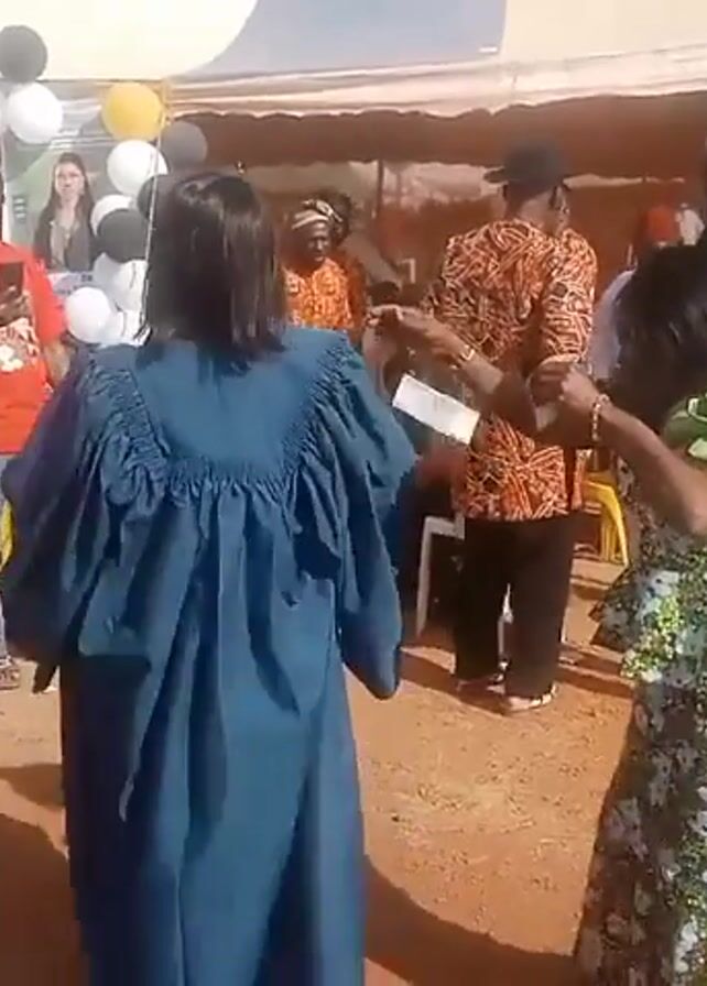 celebration outdoors, likely an event or party. People are dancing and celebrating in a sandy area. Some are dressed in traditional attire, while others wear more casual clothes. There's a car parked to the side, and a tent is set up in the background, decorated with balloons. A small band appears to be playing music, and several people are holding phones and taking pictures or videos of the event. Overall, the atmosphere is festive and lively.