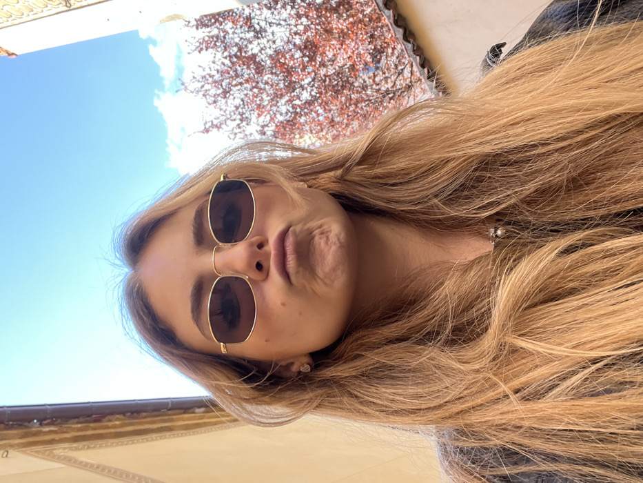 A frontal, upward-angled portrait shot depicts a female subject with long, light brown hair, parted in the middle. She wears gold-framed rectangular sunglasses with dark lenses. Her lips are pursed in a distinct pout. A small, silver-colored stud earring is visible in her left ear, and a delicate silver-colored chain necklace with a small, round pendant rests on her lower neck. She is wearing a dark-colored garment, possibly a jacket. The background features a clear blue sky with scattered white clouds. To the viewer's left, a light-colored building facade with an ornate, possibly carved architectural element is visible along the top edge. To the right, another light-colored building with a visible terracotta tile roofline frames a tree displaying sparse, reddish-brown foliage. The architecture and setting are consistent with an historic urban environment, such as a narrow street or courtyard in Segovia, Spain.