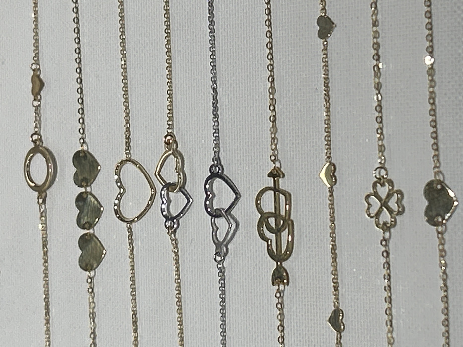 The image displays a collection of delicate chain bracelets, each featuring a unique charm. The charms vary in shape, including an open circle, stacked hearts, open heart outlines, interlocking hearts in two tones, a silver open heart, an abstract design, small scattered hearts, a clover, and a solid heart. The chains are thin and primarily gold-toned, except for one silver chain, all suspended against a bright, neutral background.