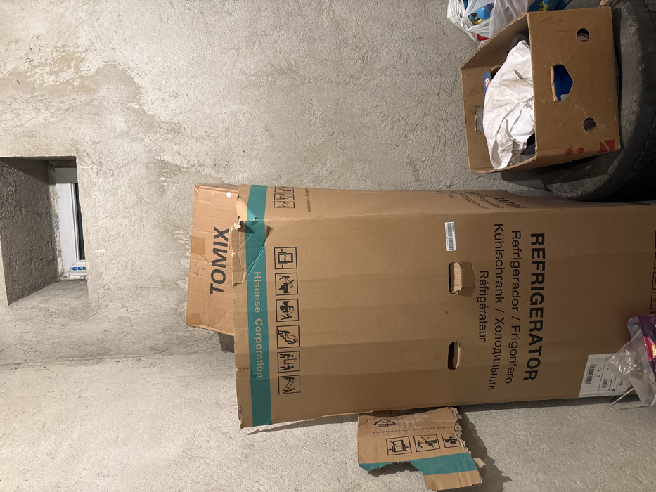 The image captures an indoor storage or utility area in Sisian, Armenia. The environment consists of unfinished, light gray concrete or plaster walls, exhibiting varied textures and some discoloration. A small, rectangular opening high on the right wall contains a white PVC window frame. The central subject is a large, upright brown corrugated cardboard box, partially damaged at the top. A teal band across its upper section bears the text "Hisense Corporation" (inverted) and several handling symbols. The box is prominently labeled "REFRIGERATOR" in large English text, followed by "Réfrigérateur / Kühlschrank / Frigorifero / Холодильник" in multiple languages. To the left of this box, a torn piece of matching cardboard, also featuring the teal band, lies on the floor. Behind and slightly to the right of the main refrigerator box, a second brown cardboard box is visible, labeled "TOMIX" in black capital letters. In the lower right foreground, a smaller, open brown cardboard box containing crumpled white fabric or debris rests on top of at least two stacked black vehicle tires. A clear plastic bag containing miscellaneous items is partially visible behind the small open box. No people are present.