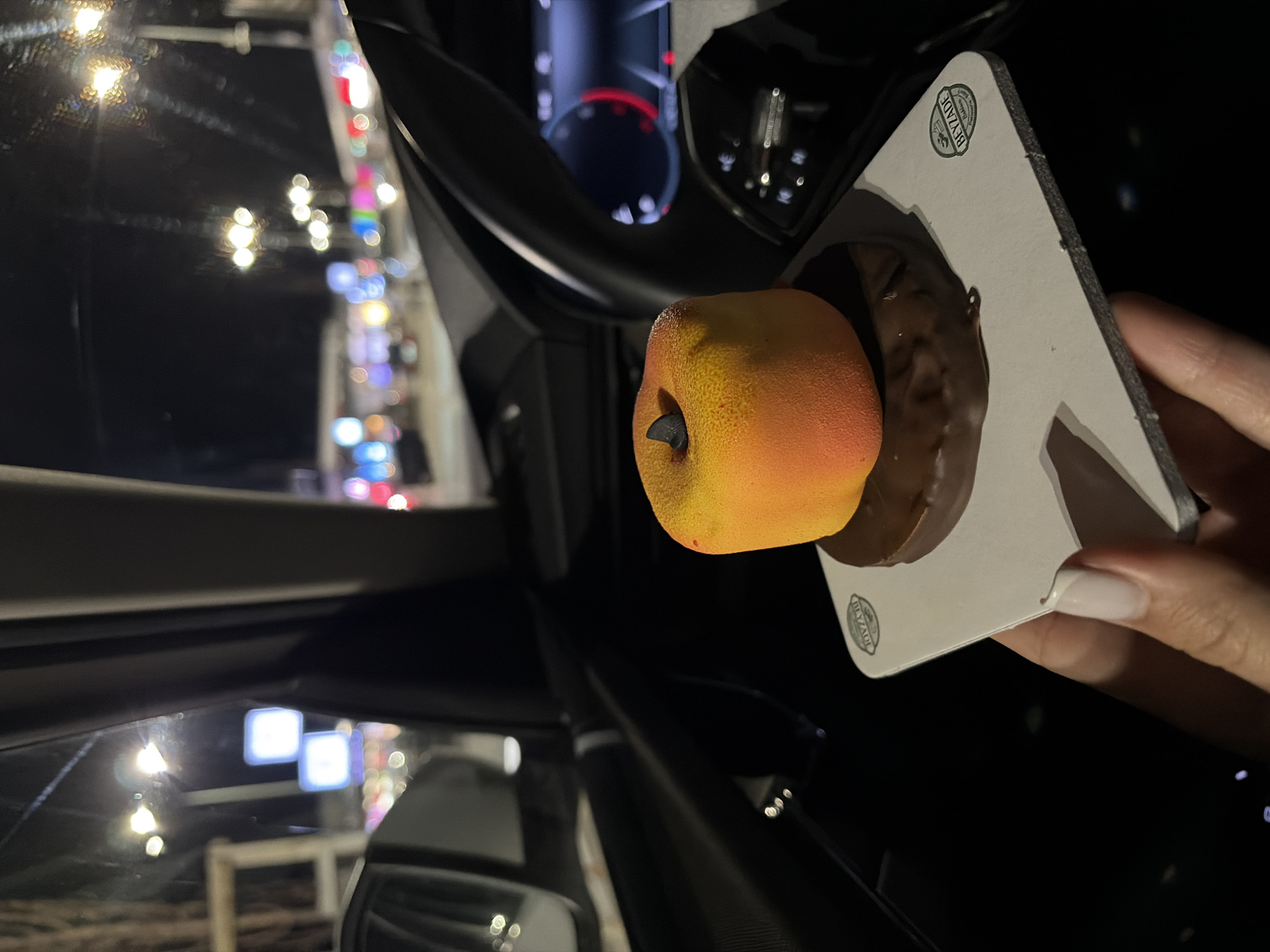 peach-shaped dessert on a coaster in a car. The coaster has a logo that reads "BEYZADE" on it. Through the window, out-of-focus city lights are visible. Based on the presence of the "BEYZADE" logo, the city is Sofia, Bulgaria, as this is a known pastry shop in that city. The car interior includes a steering wheel and dashboard with digital displays. A hand with manicured nails is holding the coaster.