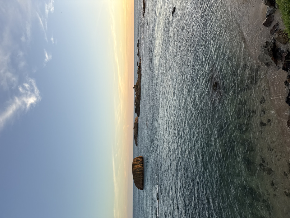 The image displays a coastal panorama at either sunrise or sunset, situated in Galle, Sri Lanka. The sky occupies the upper two-fifths of the frame, transitioning from a clear, light blue overhead to a pale orange and yellow gradient along the horizon on the right, punctuated by wispy white cirrus clouds. The ocean dominates the remainder of the scene, exhibiting a dark blue-green hue with subtle ripples indicative of calm water. In the mid-distance, a large, dome-shaped rock formation, appearing light brown to orange from sunlight, rises from the water on the left side. To its right, a cluster of smaller, dark rock formations protrudes from the ocean, with one exhibiting sparse green vegetation. Additional smaller dark rocks are scattered further towards the right horizon. The immediate foreground on the right features a rocky shoreline composed of dark, irregular stones and a narrow strip of light brown sand. The shallow water closest to the shore is clear, revealing submerged rocks and a sandy seabed. No individuals, animals, or specific actions are depicted within the frame.