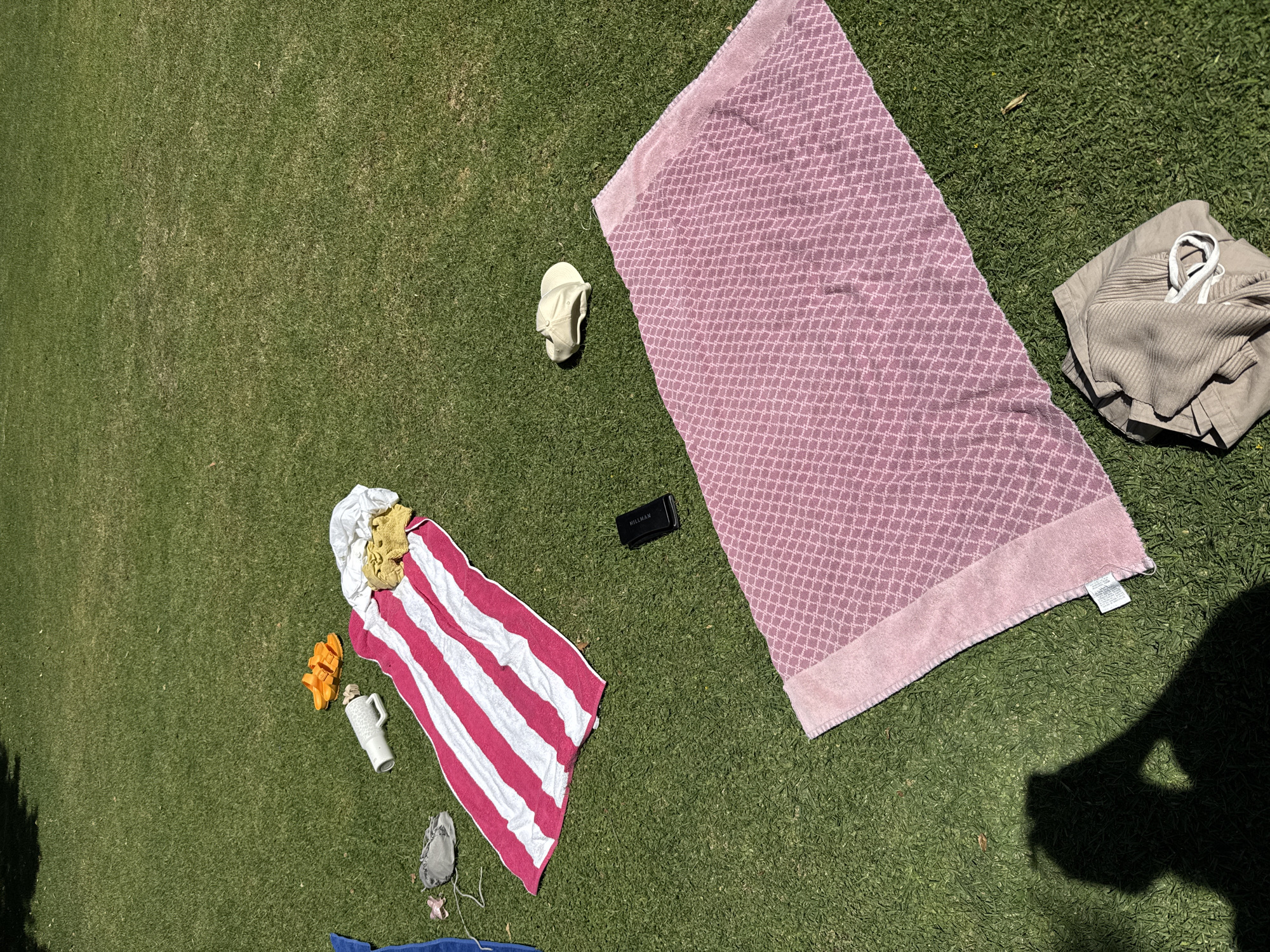 The scene is outdoors on a patch of green grass, possibly in a park or yard. There are several items scattered on the grass, suggesting someone was relaxing or having a picnic. These include: a pink patterned towel, a striped pink and white towel, a pair of gray shorts, a light-colored cap, a small black rectangular object with the name "Hillman" on it, a white mug, an orange toy, a pair of gray shoes and a blue towel. There are no people visible in the frame. Based on the shadow it appears there are trees nearby. The location is unknown, and there is no evidence to indicate that the photograph was taken in Puebla, Mexico.