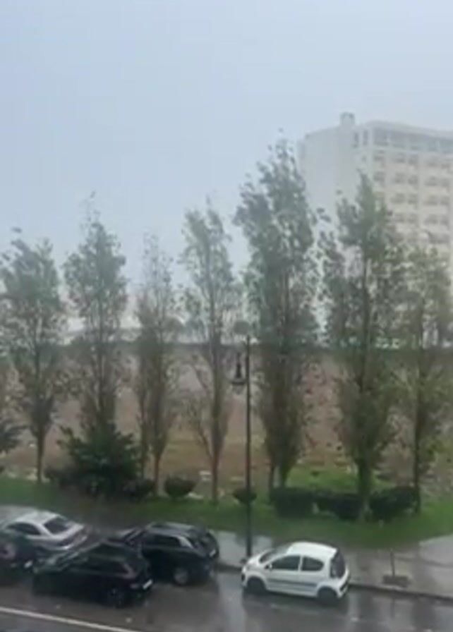 n outdoor urban scene during a hailstorm. The view appears to be from an elevated position, overlooking a street lined with parked cars. In the background, several tall buildings can be seen. Trees sway vigorously in the wind and hail. The street is wet from the precipitation, and visibility is reduced due to the intensity of the storm. A pedestrian is briefly visible.
