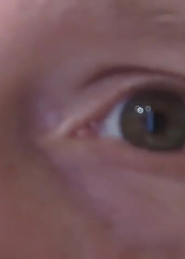 close-up of a person's eye. The eye is brown and appears to be slightly widened. The person has fair skin and the background is out of focus and appears to be a textured white surface. There is some indistinct speech in the video.
