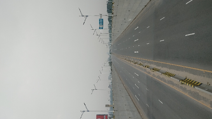 The image depicts a multi-lane, elevated expressway in Purbachal, Bangladesh, under an overcast sky. The roadway is asphalt, divided into two main directions by a central concrete barrier approximately 0.5 meters high, adorned with alternating yellow and black stripes. Both carriageways feature white dashed lane markings and white directional arrows. The road is devoid of vehicles, people, or any observable activity. To the left and right, the expressway is flanked by concrete retaining walls, suggesting an elevated structure. A series of black, multi-armed streetlights are uniformly spaced along both sides of the road, extending into the distance. In the far distance on the left, a red billboard is partially visible above the concrete wall. On the right, a rectangular blue overhead sign with white text is present above the roadway. Beyond the retaining walls, a distant cityscape with numerous buildings is discernible through a light atmospheric haze. The central barrier shows minor accumulation of sand and debris at its base.