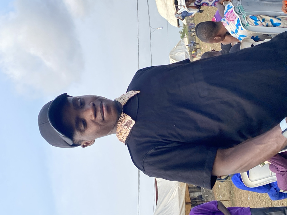 The image depicts an outdoor gathering in Epe, Nigeria, under an overcast sky. In the foreground, a young adult male stands facing slightly left, his gaze directed downwards, with a subtle smile. He wears a black baseball cap and a black short-sleeved t-shirt featuring a distinctive patterned collar with light brown and dark organic designs. A white wristband is visible on his left wrist. To his immediate left, a person in a purple top is partially visible, while further back, another individual in a blue top sits on a white plastic chair. To his right, the back of a young person's head is visible, seated on a white plastic chair, wearing a colorful garment with blue and pink patterns. The background features multiple white canopy tents, an assembly of people standing and sitting, and a single illuminated bulb hanging from a string. The ground appears to be dry, light-colored soil or dirt.