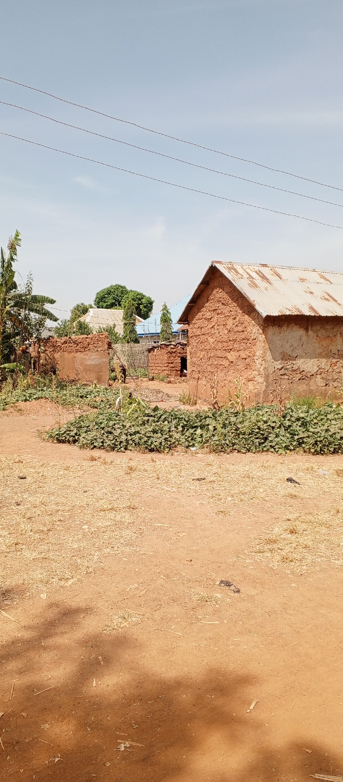 The scene, located in Kakau, Nigeria, depicts an outdoor environment under a clear, light blue sky with three parallel overhead power lines traversing the upper frame. The foreground consists of dry, reddish-brown earth mixed with patches of light brown, dry vegetation. In the midground, a dense, elongated bed of green, leafy groundcover is visible. Behind this vegetation, a cluster of single-story structures is present. To the right, a building features walls constructed from reddish-brown mud or adobe, with a section of its lower front wall appearing lighter, possibly rendered. It is topped with a steeply pitched roof made of corrugated metal, exhibiting signs of rust. Towards the center-left, several additional mud-walled structures are observed. One appears to be a partial wall or a dilapidated building section. Further back, another mud-walled structure has a dark rectangular opening, possibly a doorway. In front of this central structure, a flat area on the ground is covered with what appears to be organic material, possibly crops laid out for drying. One individual, dressed in dark clothing, is partially visible in the midground, standing or bending near the central mud structures, close to the drying material. Another individual is faintly visible further back, near the entrance of one of the mud buildings. Vegetation includes tall, slender trees and broader leafy trees in the background, along with a tall, large-leafed plant on the far left. Distant buildings with light-colored and blue roofs are visible behind the central structures. Shadows cast from unseen objects fall across the foreground earth.