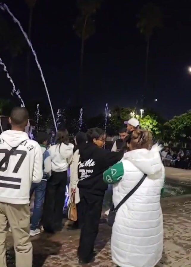 At night, a group of people are gathered around a lighted fountain. The fountain has multiple jets that shoot water in arcs and straight streams. Some of the jets are illuminated with purple light. Several people are walking near the fountain. The camera is moving around as it captures the scene. The ground around the fountain is wet. Palm trees are visible in the background.