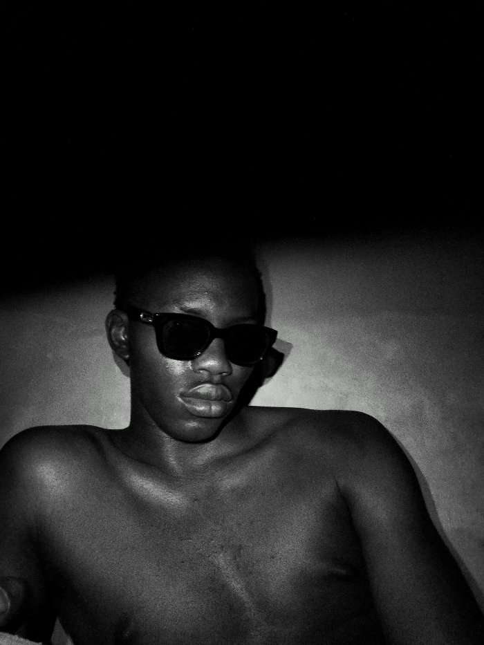 A monochromatic image shows a bare-chested person wearing sunglasses. They have dark skin and are positioned against a textured, lightly illuminated background that transitions into deep shadow above and behind them. The subject appears to be looking downward or directly ahead, with a serious or neutral expression. The lighting highlights their features, chest, and shoulders.
