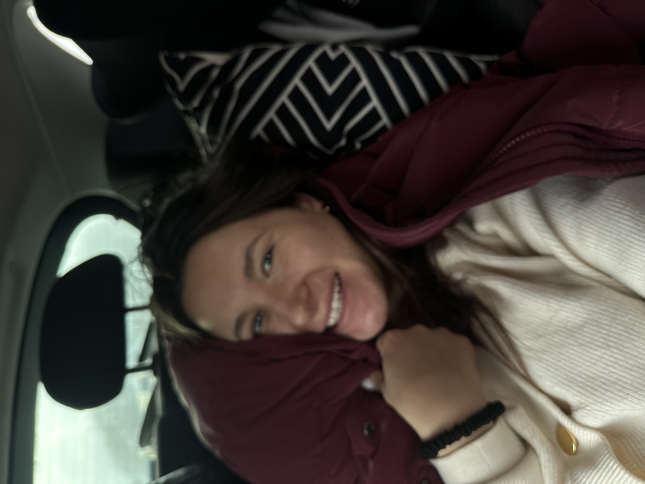 A female individual is depicted in the rear passenger compartment of a vehicle in Moskva, Russia. She has long, dark brown hair and is smiling, revealing her teeth, while looking directly at the camera. She wears a light-colored, ribbed cardigan with gold-colored buttons and a black beaded bracelet on her left wrist. A maroon puffer jacket partially covers her, with her left hand holding a section of the jacket near her face. The background shows dark car seat headrests and a blurred view through the rear window, indicating an outdoor, possibly moving, environment. A black and white geometric patterned object is visible to the right of the subject.
