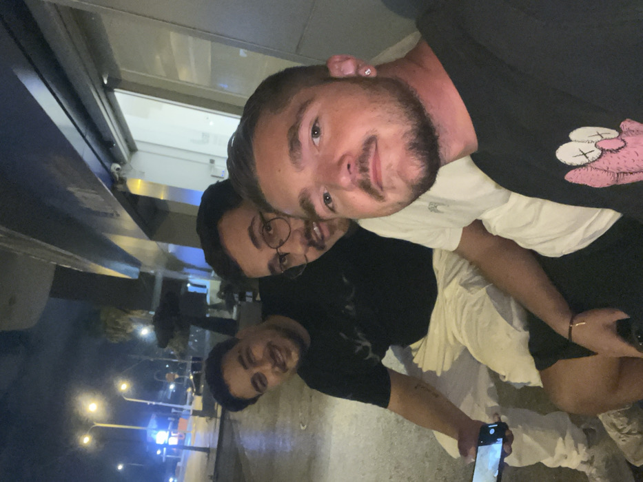Three adult males are captured in a night-time outdoor group photograph. The individual closest to the camera, positioned on the right, has short brown hair, a beard, a mustache, and a diamond stud earring in his left ear. He wears a black t-shirt featuring a pink graphic design. The central individual has dark hair, wears round-rimmed glasses, a light-colored t-shirt, and has a mustache and beard. The individual on the far left has dark hair, a beard, a mustache, and wears a dark t-shirt and light-colored pants. He holds a black smartphone horizontally in his left hand. All three are smiling and looking towards the camera. They are seated, likely on a low wall or bench, adjacent to a modern building with dark paneled surfaces. A security camera is visible on the building structure above the central individual. To the left, a street scene is illuminated by bright streetlights, with distant vehicle lights and palm trees visible. The ground appears dark and reflective, consistent with an urban environment at night in the city of Unknown, Unknown.