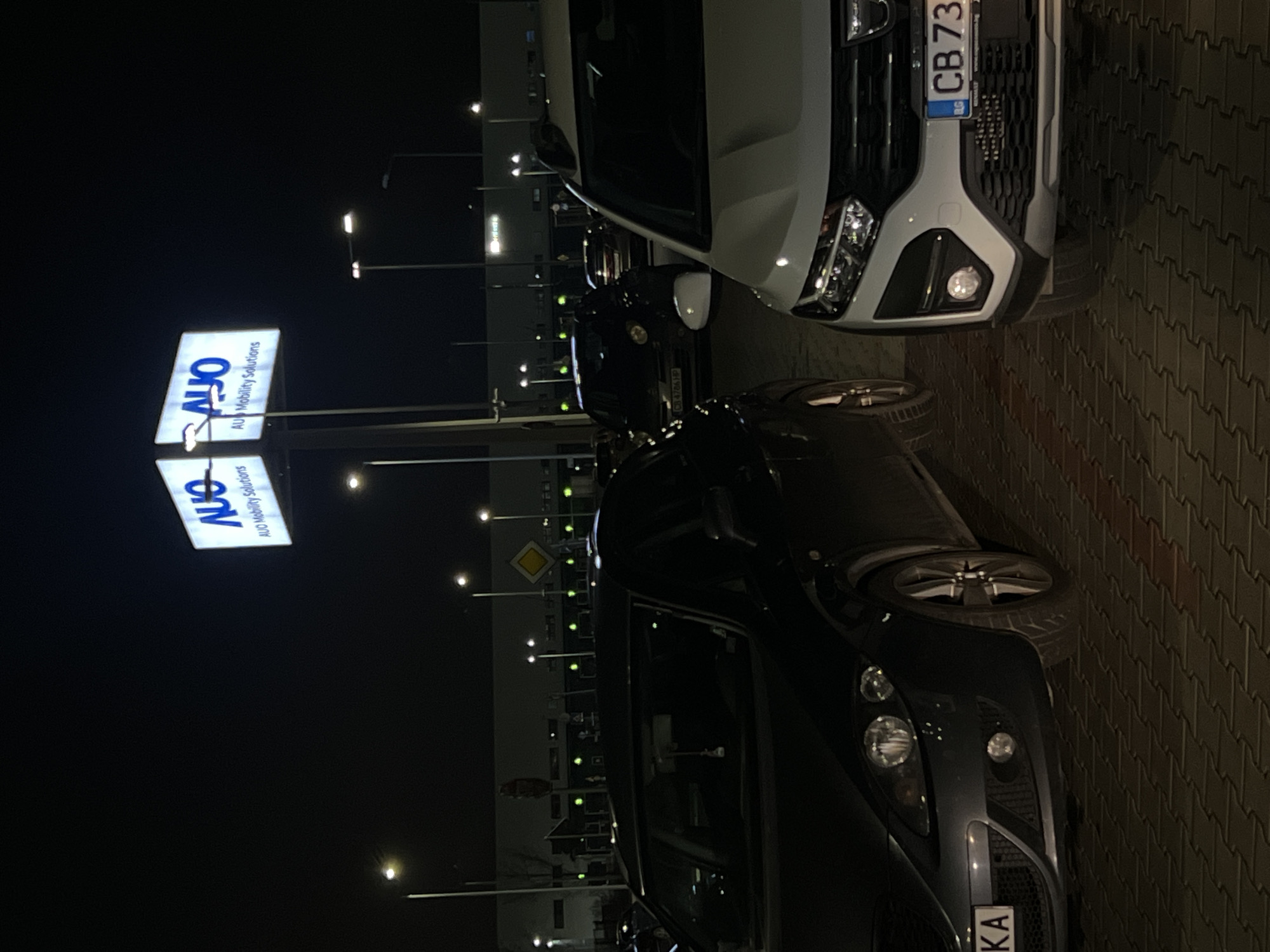The image depicts a nighttime scene in what appears to be an outdoor parking lot near an "ALJO Mobility Solutions" sign. Two cars are visible, parked adjacent to each other, angled towards the right side of the frame. The car closer to the viewer is dark-colored, while the other is white or light grey. License plates are visible on both vehicles. The background includes streetlights and possibly buildings. The ground appears to be paved with interlock pavers. There are no people visible in the image. The location is in the city of Bozhurishte, Bulgaria.