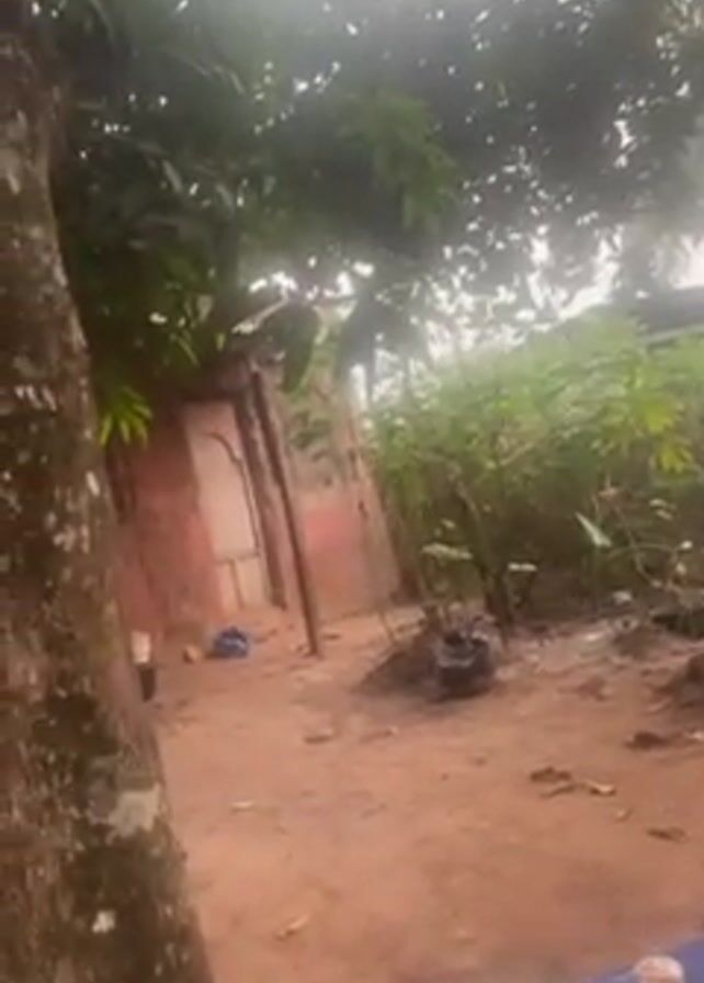 The video depicts an outdoor scene, likely a backyard or garden area. A person in a yellow shirt is visible in the foreground. The ground is a reddish-brown color, possibly dirt or soil. There is vegetation in the background, including trees and plants. A building with a red exterior and a window is also visible in the distance. The overall atmosphere appears hazy or foggy. There's also a table at the bottom of the frame.