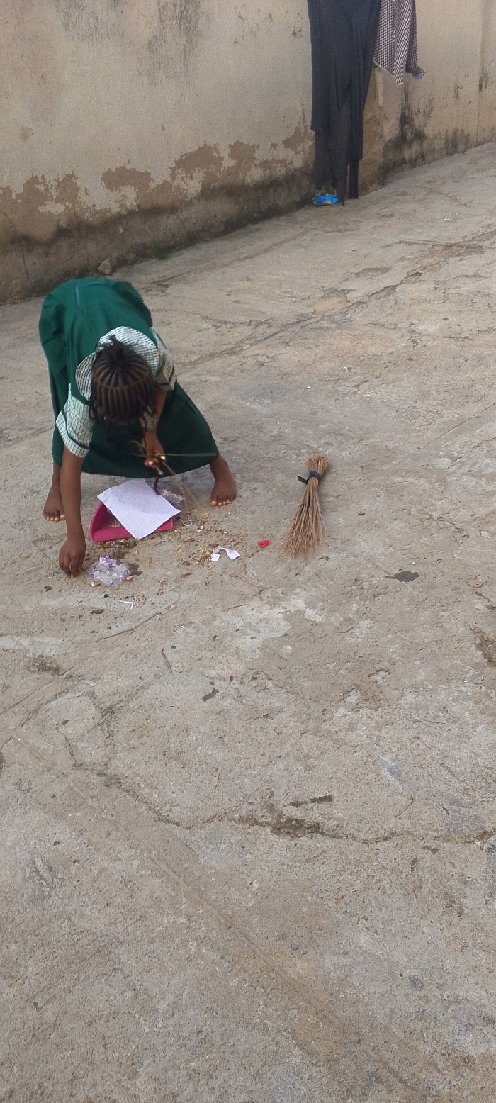 A young person in a green school uniform bends over to sweep litter on a concrete surface. There is a small broom and a pink dustpan nearby. Debris including paper scraps and food particles surround the child. Behind the child is a wall with some clothes hanging on a line in the background. The ground is cracked and uneven.