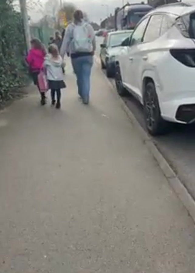A woman is walking on a sidewalk, holding the hands of two young girls who appear to be in school uniforms. The woman is wearing jeans, a light-colored hoodie, and a backpack. The girls are wearing skirts and jackets, with one having a pink jacket and the other a light-colored one. They are all walking away from the camera. Cars are parked along the side of the road next to the sidewalk, including a white Hyundai Tucson. A garbage truck is visible further down the road, among other cars and people. The sky is overcast, and the overall scene appears to be a typical suburban street.