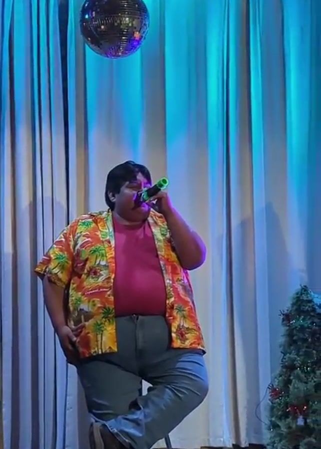 A heavy-set man is singing into a green toy microphone while sitting on a metal stool. He is wearing an orange Hawaiian shirt over a pink t-shirt and blue jeans, and brown work boots. A disco ball hangs from the ceiling. The backdrop is a light blue curtain. A Christmas tree is on the right.