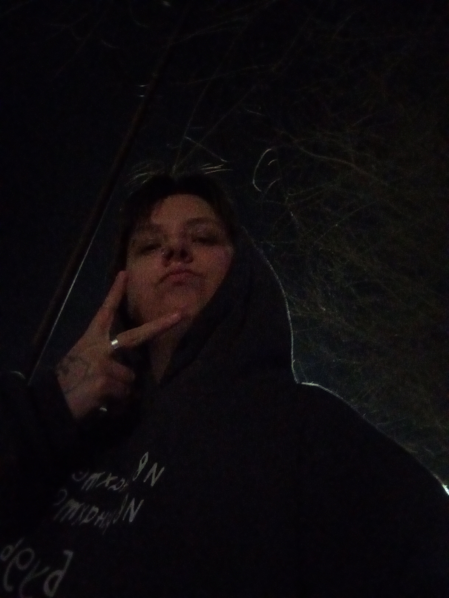 An individual is captured in a low-light image, illuminated from the front and slightly below. The subject, positioned in the lower-left quadrant, is a young adult with dark hair, a visible septum piercing, and light complexion. They wear a dark hooded sweatshirt with the hood up, partially obscuring the head. White, partially illegible text, including the word "DEAD," is visible on the sweatshirt's chest. The subject's right hand, adorned with a silver-colored ring on the ring finger, is raised to the left side of the face, forming a "peace sign" with the index and middle fingers extended. Faint tattoos are discernible on the back of the right hand/wrist. The background is predominantly dark, featuring a network of thin, light-colored lines across the upper and right portions, consistent with bare tree branches or entangled natural fibers. An angular, dark structure is visible along the left edge of the frame. No specific visual identifiers are present in the image to confirm the requested location as Saratov, Russia.