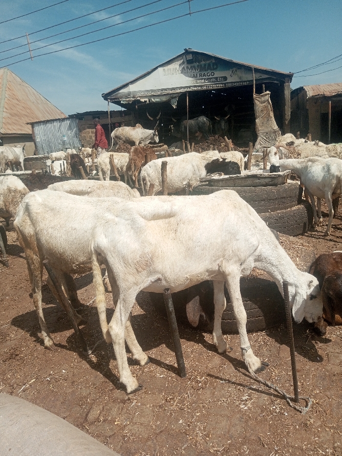 An outdoor livestock market scene in Rigasa, Kaduna State, Nigeria, is depicted under a clear blue sky