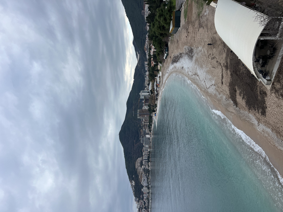 This image presents an elevated view of Budva, Montenegro, along the Adriatic coast, under an overcast sky