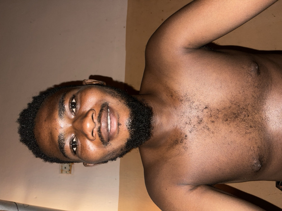 A dark-skinned man with a close-cropped hairstyle and a full, dark beard smiles, displaying white teeth. He is shirtless, revealing chest hair and smooth shoulders. The lighting is dim, casting subtle shadows. The background consists of a beige wall on the left and a light brown wall on the right. A white electrical outlet is visible on the left wall.