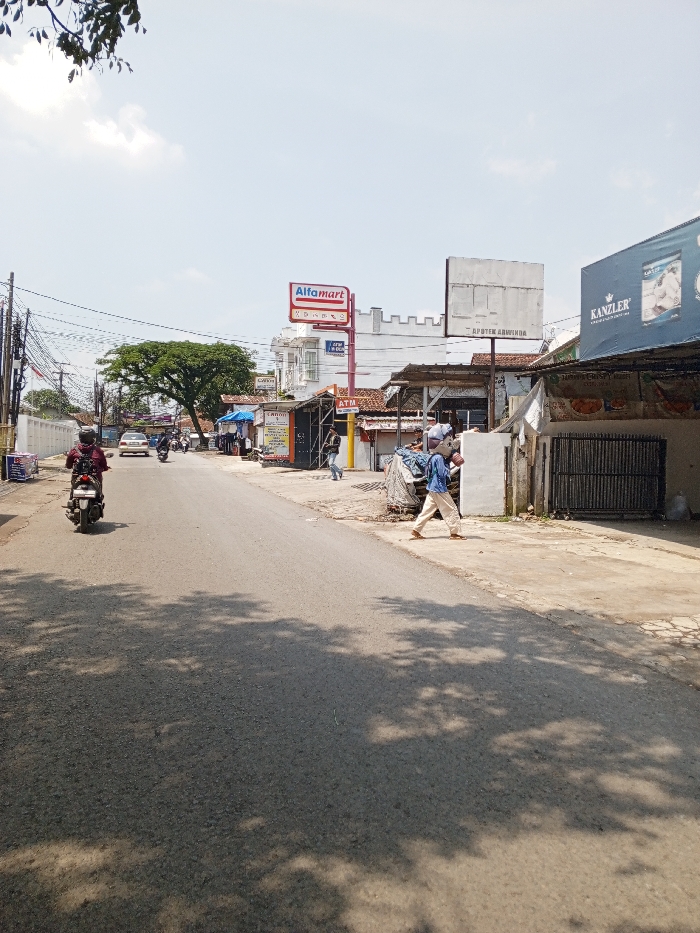 The image displays a sunlit urban street scene. An asphalt road dominates the center, stretching away from the viewer. On the left side of the road, a person in a dark jacket rides a red and black motorcycle away from the camera. Further down on the left, a white car is visible, followed by another motorcycle. The left side of the street is lined with buildings and utility poles burdened with numerous overhead wires. A prominent white building with a crenellated parapet features a red and white "Alfamart" sign and an "ATM" sign. A large green tree is visible in the mid-ground. On the right side of the road, a concrete sidewalk runs parallel to the street. A person, dressed in a light blue long-sleeved shirt and light-colored trousers, walks away from the camera, carrying a large, irregularly shaped bundle over their right shoulder. Adjacent to the sidewalk are various commercial structures, some appearing informal, with metal gates and tarpaulin coverings. A blank billboard stands above text that includes "APTEK ARWINDA." To the far right, a large blue sign displaying "KANZLER" is mounted on a building. Dappled shadows from trees are cast across the road. The sky is partially cloudy. Based on the "Alfamart" and "Aptek Arwinda" signage, the location is identified as likely being in Indonesia, not Multhan, India.