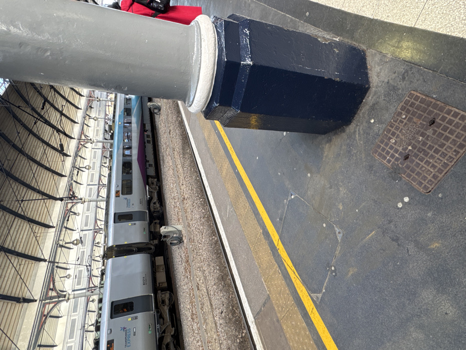 An interior view of a railway platform at Newcastle Central Station in Newcastle upon Tyne, United Kingdom, shows a stationary train and structural elements. In the right foreground, a large, grey cylindrical column with a white decorative ring at its base transitions into a dark blue octagonal lower section. Adjacent to the column's base on the platform floor, a square, textured metal access cover with "FOR LIFTING" partially legible is present. The back of a person wearing a bright red coat is partially visible behind the column, facing away from the camera. The platform surface is dark grey, featuring a continuous yellow safety line running parallel to the tracks. Lighter grey tactile paving sections are visible near the platform edge. Beyond the platform, two sets of railway tracks are laid on a gravel ballast bed. An electrical connection box with coiled cables stands between the platform and the tracks. A stationary TransPennine Express Class 802 passenger train, identified by unit number 802214, occupies the tracks. The train features a silver/grey body with a distinct purple and teal/light blue stripe along its side, and "TransPennine Express" branding is visible. The background reveals the station's high, arched, structural roof composed of metal trusses and panels, with overhead electrical catenary lines and multiple suspended light fixtures. The scene is illuminated by ambient daylight.