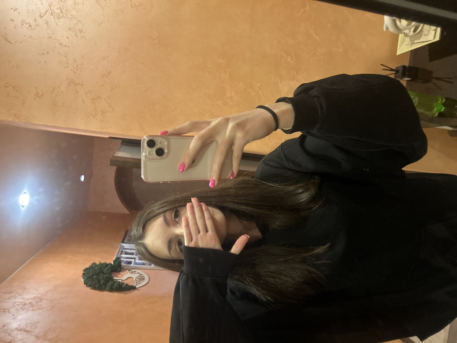 A young female is depicted in a mirror selfie, captured indoors. The subject is centrally framed, with long, dark, straight hair. She is wearing a black hooded sweatshirt with wide, cuffed sleeves. Her right hand, which has bright pink nail polish and a black elastic band on the wrist, holds a light-colored smartphone with a clear case to take the photograph. Her left hand, also with pink nail polish, is raised and covers her mouth, while her eyes are visible and directed towards her left (the viewer's left). The environment reflected in the mirror consists of an indoor space with walls featuring an orange-toned, textured finish. A bright, recessed ceiling light is visible in the upper left of the reflection, with another fainter light further back. To the left of the subject's head, a wall decoration resembling a stylized white tree base with green, fibrous foliage is visible. To the right, a dark surface (possibly a table or shelf) holds a tall glass bottle containing green liquid, a smaller dark object, and a white sculptural figurine, possibly a marine animal. An arched architectural opening is faintly discernible in the background reflection. The specific location in Kudrovo, Russia, is stated in the prompt but not visually verifiable within the image itself.