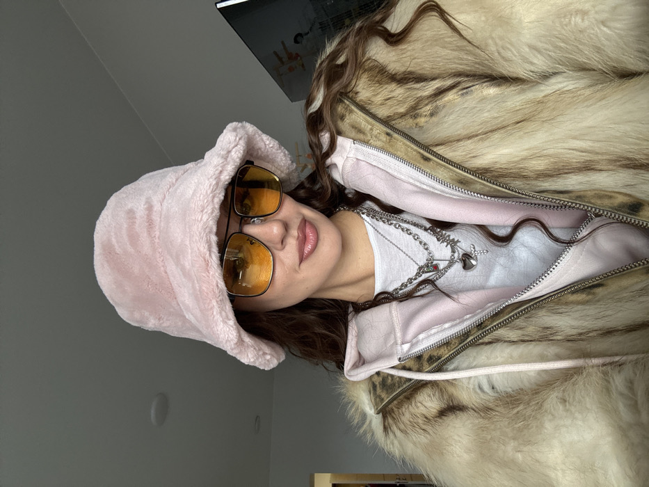 The image depicts an adult female indoors in Krasnoyarsk, Russia, captured from the waist up. She wears a light pink faux-fur bucket hat and aviator-style sunglasses with amber lenses and a black metal frame. Her visible hair is long, wavy, and dark brown, framing a face with a slight smile and glossy pink lips. Her attire consists of a white crew-neck t-shirt, a light pink zippered hooded sweatshirt, and an open jacket constructed from light-toned fur or faux fur with brown patterning. Multiple layered silver-tone necklaces are visible over the t-shirt, displaying various charms including a small rectangular red and green element, a safety pin, a textual charm, a puffed heart, and a cross. The background features a plain light-colored wall with a recessed ceiling light in the upper left and a dark, reflective rectangular object, likely a television screen, in the upper right.