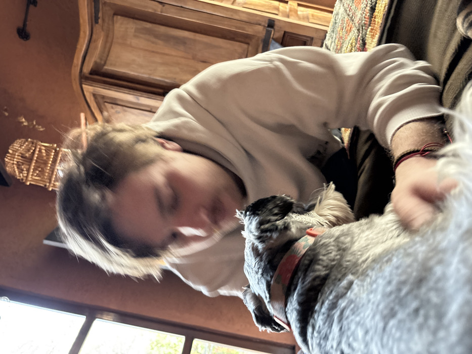 - "A blurry, low-angle shot captures a person in a light-colored hooded sweatshirt bending toward a grey and white dog" by FM-FnHOE2, licensed under CC BY 4.0