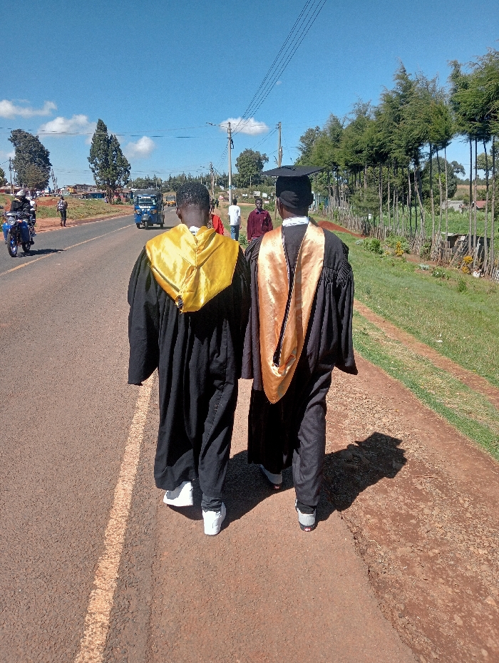 Two individuals in graduation attire walk away from the camera on a reddish-brown dirt path adjacent to a paved road in Shamenei, Kenya