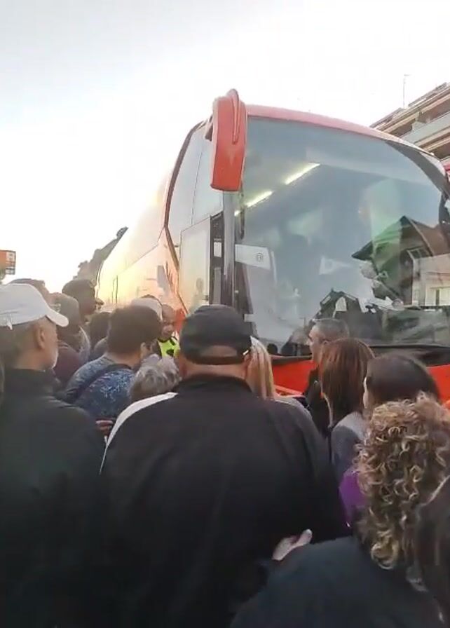 A large group of people are clustered around the open door of a large red and white bus. Some individuals are attempting to board the bus. People in the crowd are wearing a variety of clothing, including jackets, hats, and sweaters. A person wearing a yellow and black vest, possibly a security guard or bus employee, is visible near the front of the bus, seemingly assisting or directing the boarding process. The sky is visible in the background, with colors suggesting either early morning or late afternoon. Buildings are visible in the background.