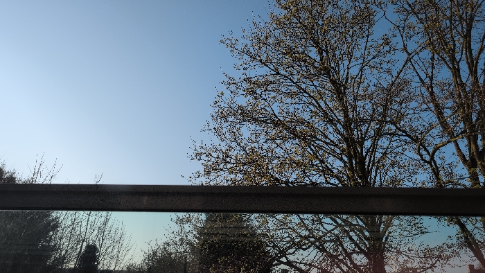 The image depicts an outdoor scene, purportedly located in Venray, Netherlands. The upper two-thirds of the frame show a clear, light blue sky on the left, transitioning to the branches and nascent foliage of several deciduous trees on the right and in the upper center. These trees exhibit numerous small buds or early leaves, suggesting late winter or early spring. A prominent dark, textured horizontal bar or frame, possibly a window sill or railing, spans the width of the image at approximately the lower third mark. Below this bar, a reflective surface, likely glass, captures an inverted and slightly muted reflection of the trees and sky seen above. No individuals, overt actions, or specific man-made structures beyond the frame and reflective surface are discernible. The lighting suggests either early morning or late afternoon sun, casting soft illumination on the scene.