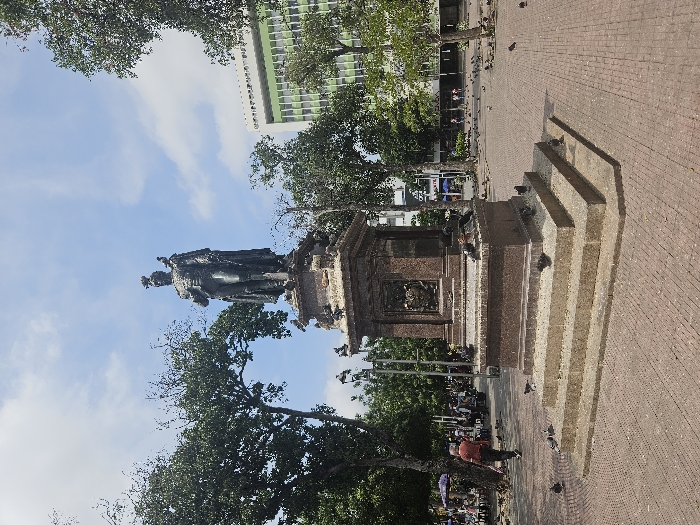 A statue atop a multi-tiered stone base dominates a plaza, surrounded by trees