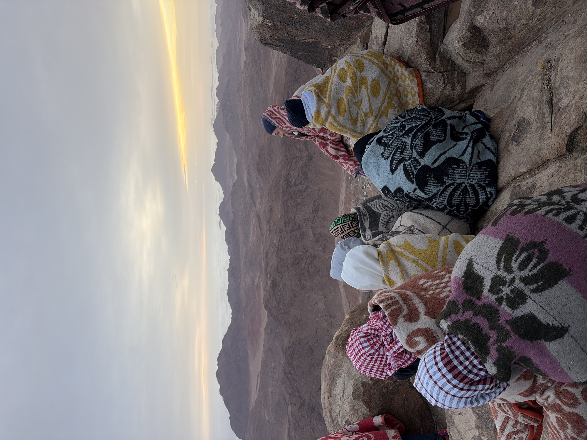 group of people wrapped in blankets sitting on rocks at a high altitude, overlooking a mountainous landscape at sunrise
