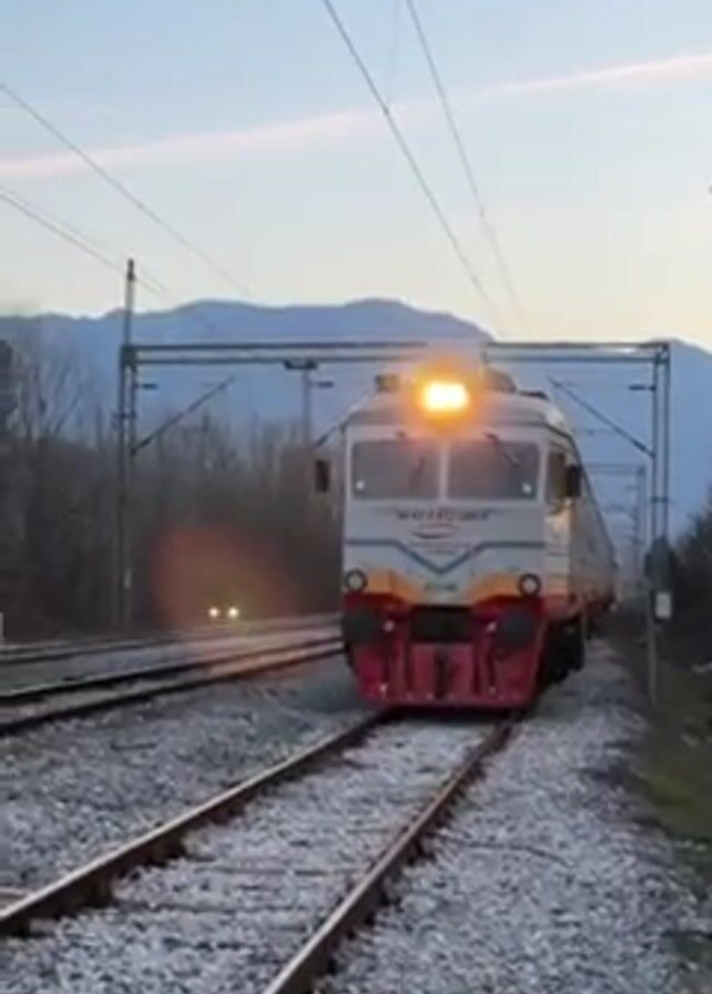 A train with the number 412-046 is traveling along a train track. The train is primarily gray and orange with red accents. A mountain is in the background, with power lines visible above. The train is traveling at a high speed, causing motion blur.
