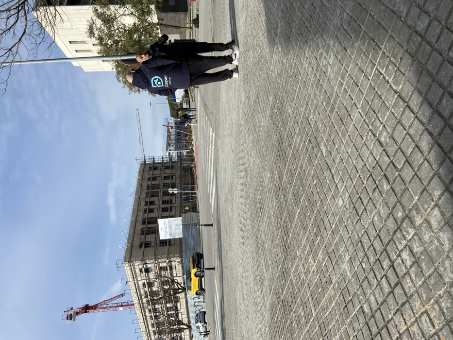 A construction site is visible with scaffolding covering the building. A red crane is present. In the foreground, two people stand on a crosswalk near a sidewalk with diamond-patterned tiles. The person nearest the camera is wearing a blue jacket with "Dayper" printed on the back. A yellow car and other vehicles are parked near the building. The sky is blue with some clouds.