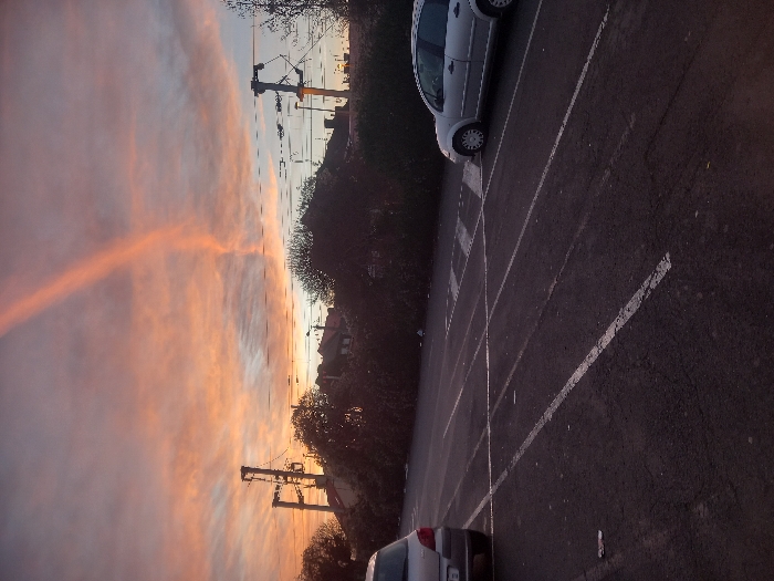 The image captures an outdoor scene at sunrise or sunset in Sallaumines, France. The upper sky displays vibrant orange, pink, and light blue clouds, bisected by a distinct, elongated, reddish-orange streak extending diagonally from upper left towards the lower mid-right. The foreground consists of a dark asphalt surface with faded white parking or road markings. A silver hatchback's rear quarter is visible on the far left. Another silver hatchback is parked facing left on the right side of the asphalt. Minor debris is scattered on the ground. The mid-ground features a dense line of dark green vegetation. Behind this vegetation, residential or commercial buildings are partially visible. Two tall metal utility poles with visible wires stand against the sky on both the left and right sides of the background, with horizontal lines stretching across the scene.