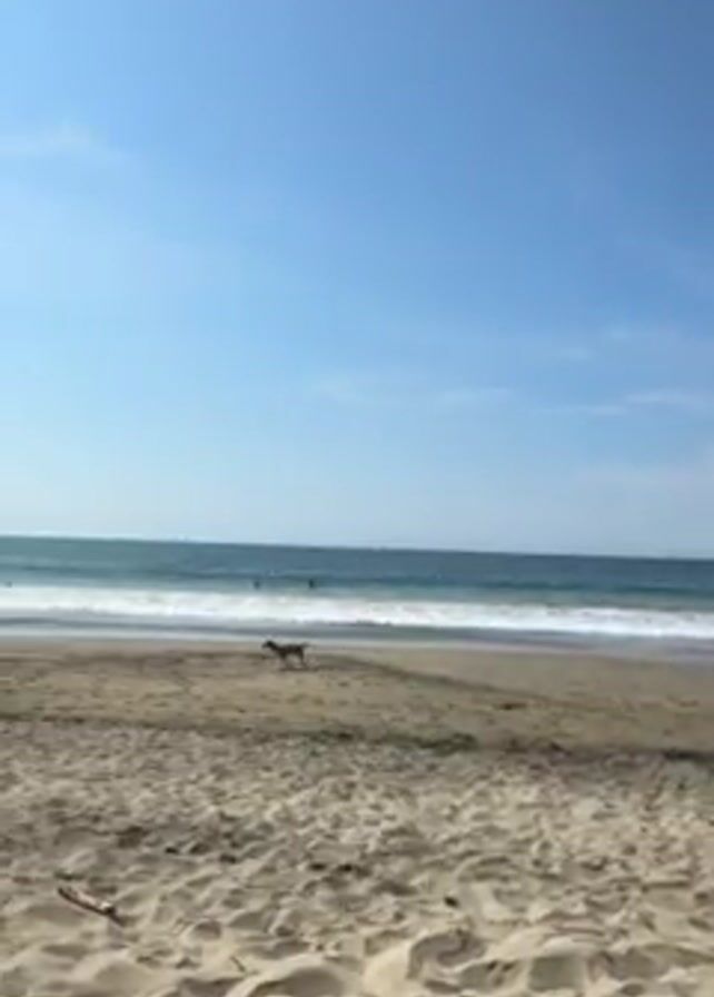 sandy beach on a sunny day. A dog is running towards the water. Several people are in the water, seemingly swimming or surfing. The sky is blue with a few clouds. There are some personal items like shoes and a towel on the sand in the foreground. The water has small waves.