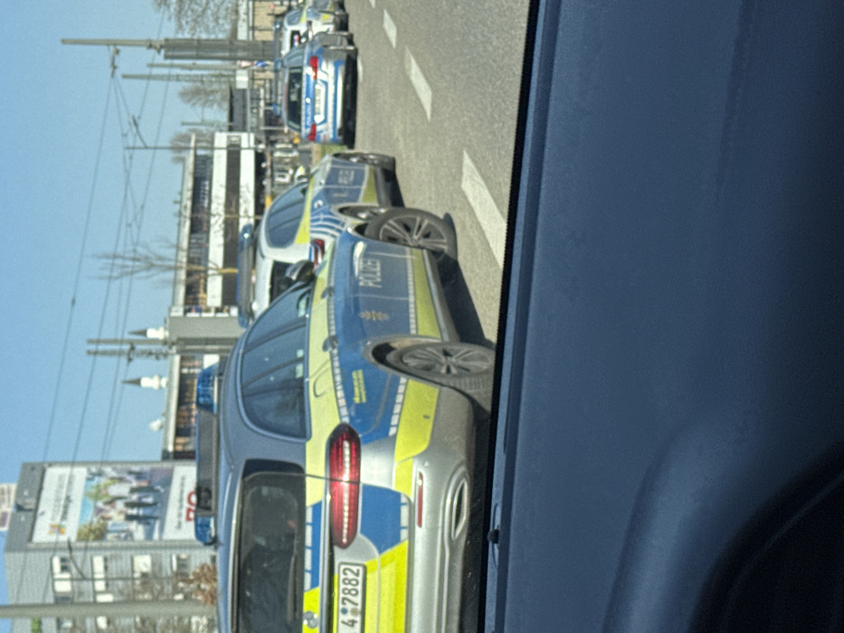 - "The image, taken from within a vehicle looking forward, displays a line of five German police vehicles on a multi-lane asphalt road in Kehl, Germany, under clear daylight conditions" by FM-9wXCm1, licensed under CC BY 4.0