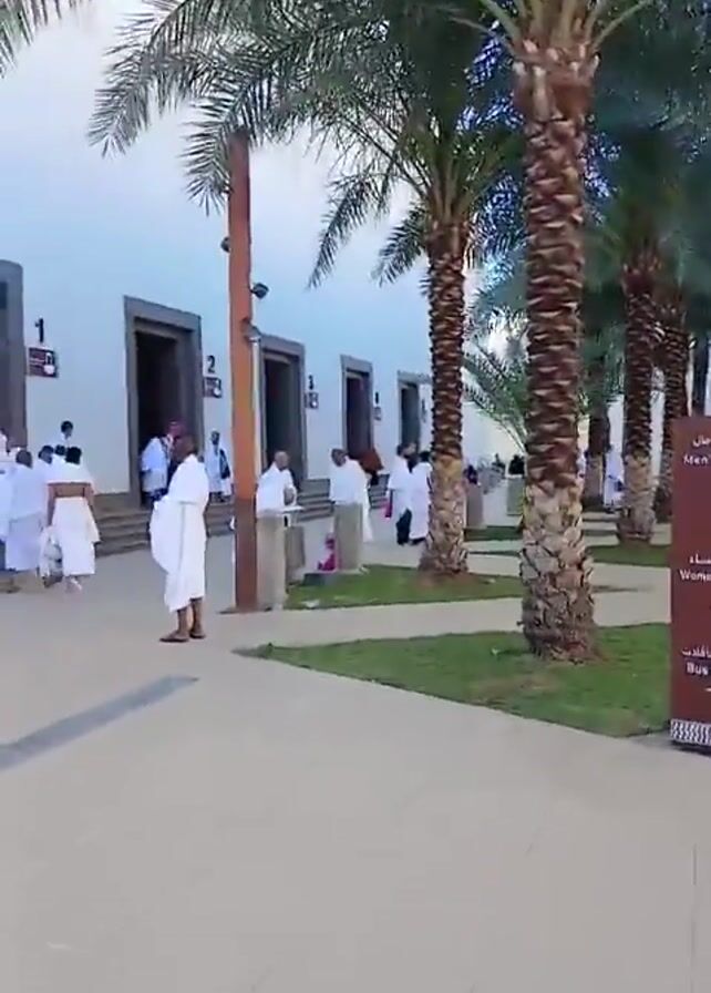 people walking near a building in an outdoor environment with palm trees. Many of the people are wearing white robes or garments. The ground is paved with light-colored tiles, and there are small patches of green grass. A brown sign with white lettering indicates directions to "Men's Prayer," "Woman's Prayer," and "Bus parking." The camera moves, following a person dressed in white as they walk along the pathway.