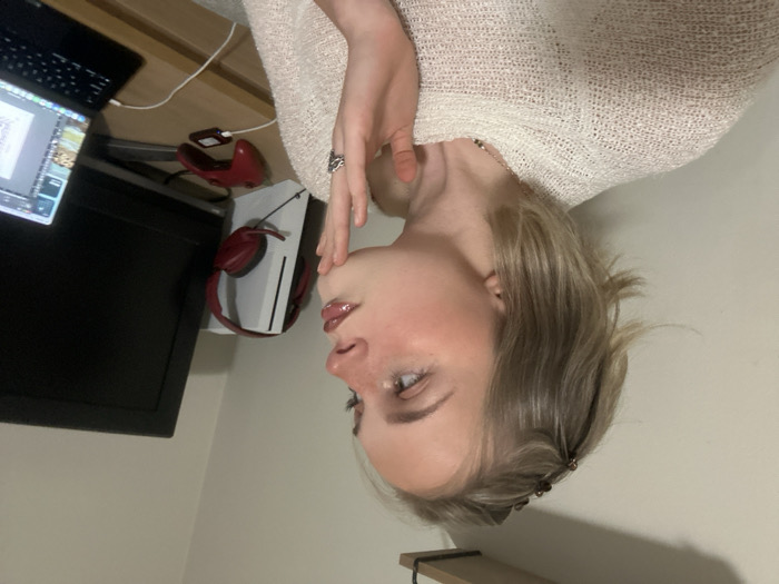 An indoor photograph depicts a light-skinned female with short blonde hair, styled with small brown clips on the right side of her part, and light makeup including rosy cheeks and glossy lips