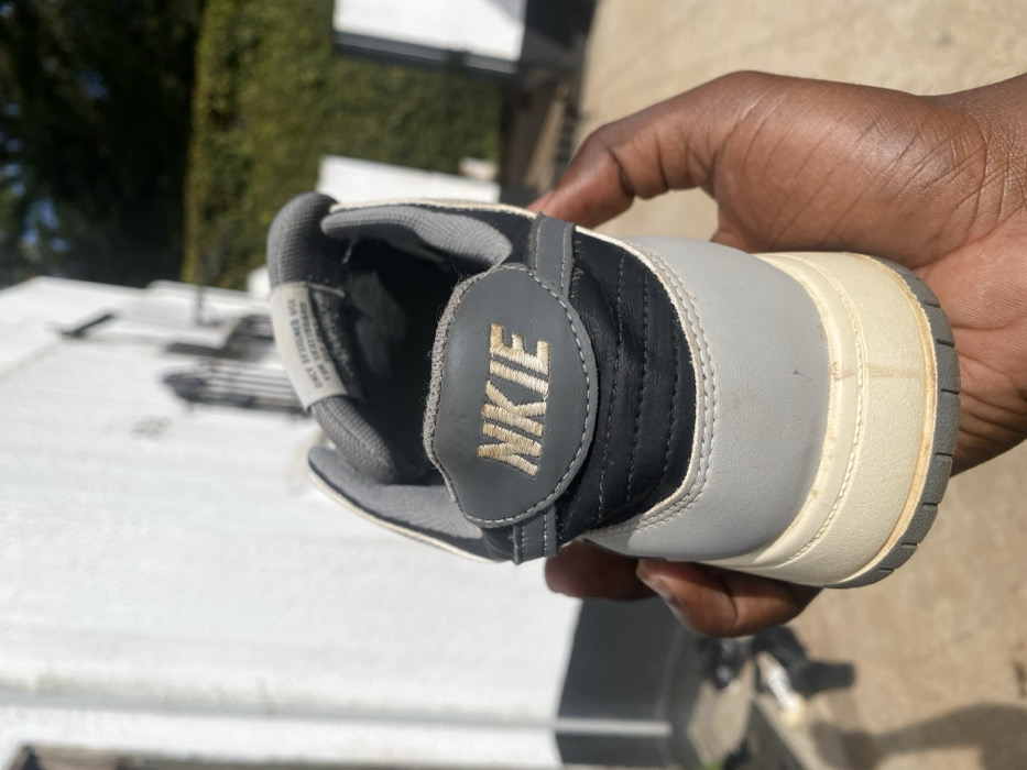 A close-up shot reveals a sneaker's heel, held in a hand. The shoe features a gray, black, and cream color scheme. The heel tab, gray in color, displays "NKIE" embroidered in gold. The shoe's upper is a mix of gray and black leather, while the midsole is a creamy off-white. The overall look is worn, indicated by the visible wear and dirt marks.