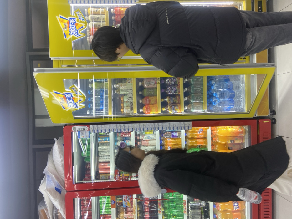 This image depicts a beverage aisle within a retail store in Jiangjin, China. Two individuals are present. On the left, a female is observed in profile, wearing a long black puffer coat with a prominent white fur hood, light-colored trousers, and eyeglasses. A purple hair roller is visible in her dark hair. She holds a clear plastic bottle with a red and white label in her right hand, positioned at her side, and is oriented towards the right side of the frame. Behind her are two red-framed, glass-fronted display refrigerators, fully stocked with a variety of canned and bottled beverages. White bags of merchandise are stacked atop these red coolers. On the right, a male subject is seen from behind, dressed in a black puffer jacket and grey jeans. He stands before an open, yellow-framed, glass-fronted refrigerator, which is labeled with Chinese characters "冰红茶" (Iced Black Tea) and filled with rows of bottled drinks, including water and various teas/juices. An identical, closed yellow cooler stands adjacent to it. The male is looking into the open cooler, appearing to select a beverage. The floor is white-tiled, and the area is brightly lit.