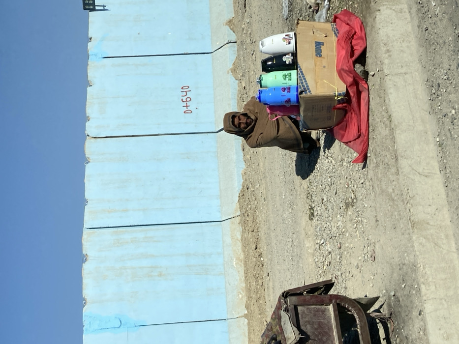 A man wrapped in brown clothing stands next to a concrete wall. He has various items stacked beside him, including colorful beverage containers, a cardboard box labeled "Home," and a red cloth. The ground is gravelly. An old, dilapidated vehicle frame lies at the bottom. The sky is a clear, light blue. The image is taken at a slightly oblique angle.