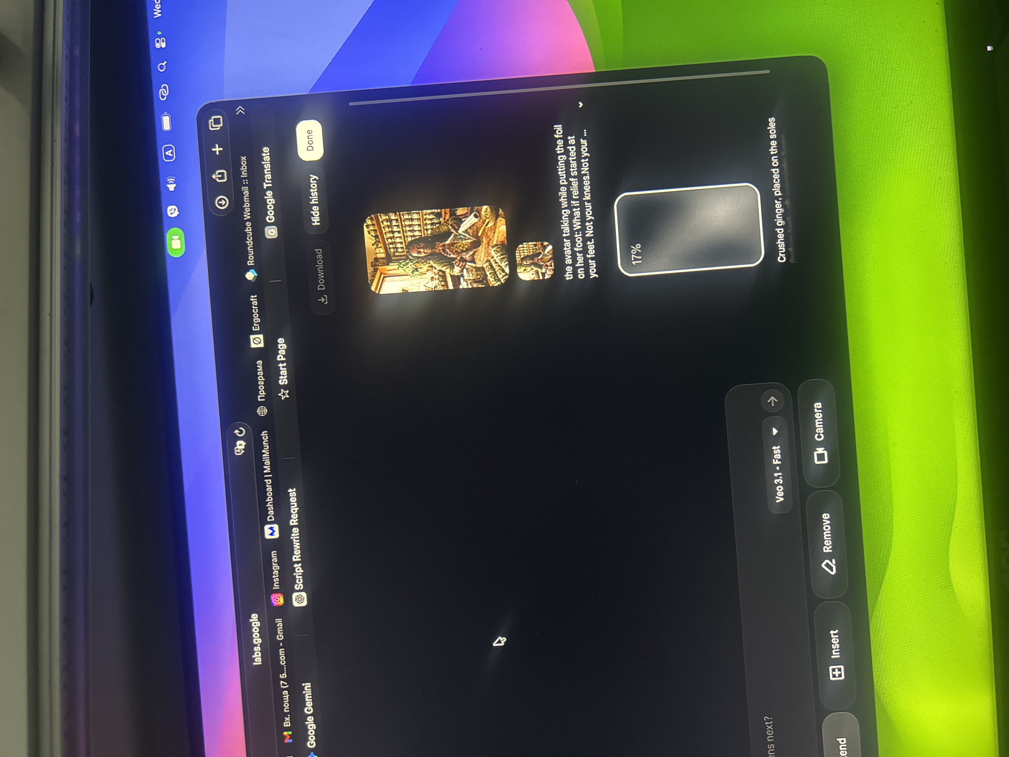 screen capture of a computer display, possibly a laptop. Various browser tabs are open, including "labs.google," "Google Gemini," "Roundcube Webmail :: Inbox," "Google Translate," "Instagram," "Dashboard | MailMunch," "Script Rewrite Request," "Програма," and "Start Page." The main window appears to be a Google service (likely connected to image generation or editing), displaying an image of a person in what appears to be a shop. There is associated text mentioning "foil on her foot" and "crushed ginger, placed on the soles." A progress bar shows 17%. There is also a menu with options like "Insert," "Remove," "Camera," and "Veo 3.1 - Fast." There is no specific indication in the image connecting the content to the city of Voluyak, Bulgaria.