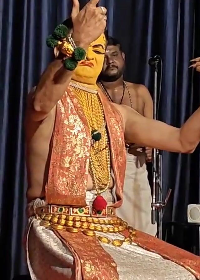 A male performer in traditional Kathakali costume and makeup sits center stage against a dark blue curtain